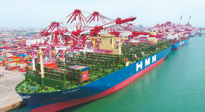4月26日,载箱量2.4万标准箱的全球首艘最大集装箱班轮——THE联盟“HMM阿尔赫西拉斯”轮首航仪式在山东港口青岛港举行,标志着山东港口集装箱业务迈入2.4万标准箱“大船时代”。 潘俊强 兰文鹏摄(人民视觉)