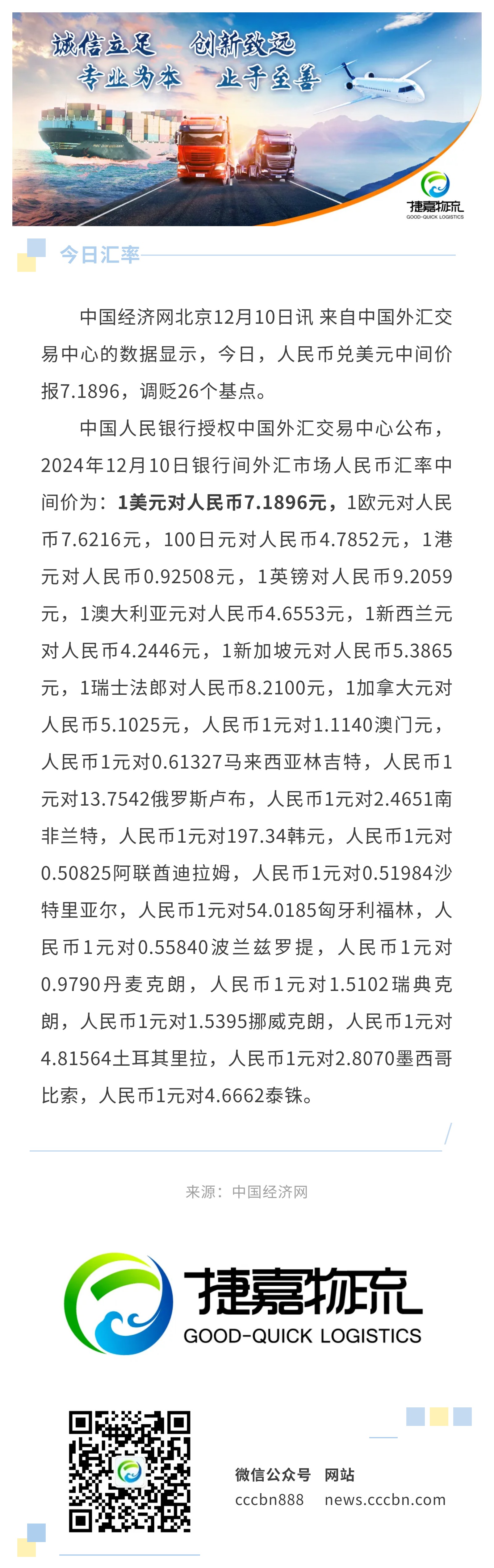 12月10日人民币兑美元中间价报7.1896,调贬26个基点