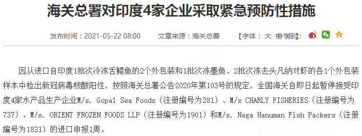 因从进口自印度1批次冷冻舌鳎鱼的2个外包装和1批次冻墨鱼、2批次冻去头凡纳对虾的各1个外包装样本中检出新冠病毒核酸阳性,按照海关总署公告2020年第103号的规定,全国海关自即日起暂停接受印度4家水产品生产企业M/s. Gopal Sea Foods(注册编号为281)、M/s CHARLY FISHERIES(注册编号为737)、M/s. ORIENT FROZEN FOODS LLP(注册编号为1901)和M/s. Naga Hanuman Fish Packers(注册编号为1831)的进口申报1周。