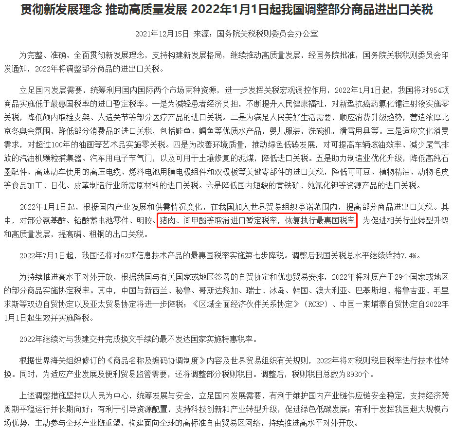 2022年1月1日起,根据国内产业发展和供需情况变化,在我国加入世界贸易组织承诺范围内,提高部分商品进出口关税。其中,对猪肉等取消进口暂定税率,恢复执行最惠国税率。