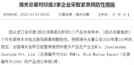 因从进口自印度1批次冻南美白虾的1个产品本体样本,1批次冻章鱼的1个外包装样本中检出新冠病毒核酸阳性,按照海关总署公告2020年第103号的规定,全国海关自即日起暂停接受印度水产品生产企业M/s. Jayalakshmi Seafoods Pvt. Ltd.(注册编号为924)和M/s. Rich Marine Export(注册编号为1206)的产品进口申报1周。