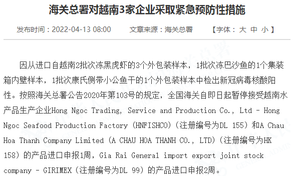 因从进口自巴基斯坦2批次冻带鱼的6个外包装样本,1批次冻舌鳎鱼的1个外包装样本中检出新冠病毒核酸阳性。按照海关总署公告2020年第103号的规定,全国海关自即日起暂停接受巴基斯坦水产品生产企业M/s. Maritime Seafood(注册编号为T-270/2012)、M/S Mukhi Noordin& Sons(注册编号为T-03/98)和M/s. ACE Fisheries(注册编号为T-532/06)的产品进口申报1周。