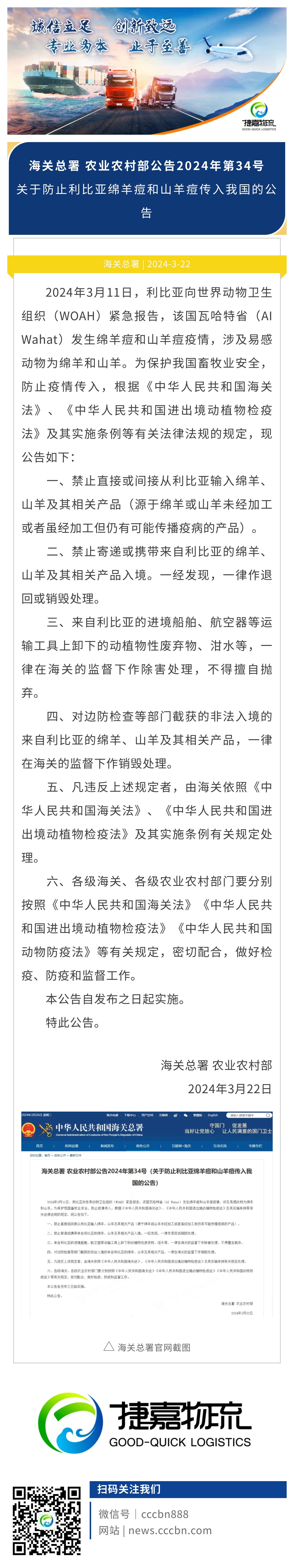 捷嘉 · 关注 | 海关总署 农业农村部:关于防止利比亚绵羊痘和山羊痘传入我国的公告