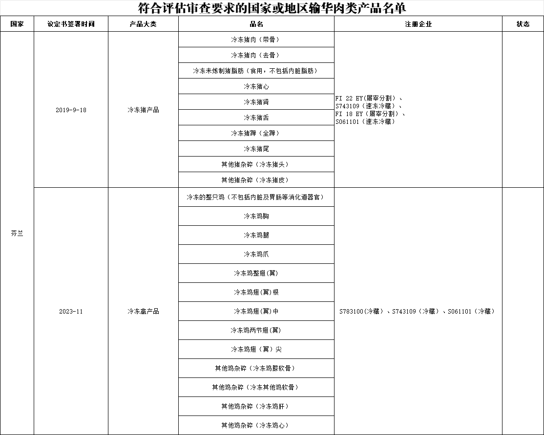 近日,海关总署更新《符合评估审查要求的国家或地区输华肉类产品名单》:
