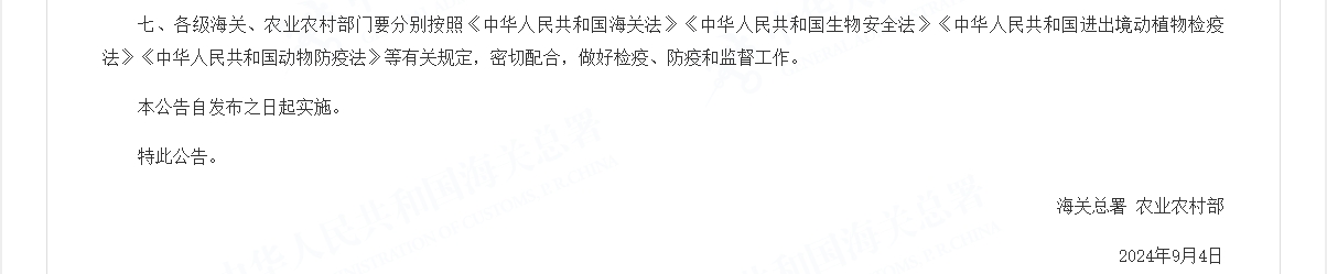 七、各级海关、农业农村部门要分别按照《中华人民共和国海关法》《中华人民共和国生物安全法》《中华人民共和国进出境动植物检疫法》《中华人民共和国动物防疫法》等有关规定,密切配合,做好检疫、防疫和监督工作。