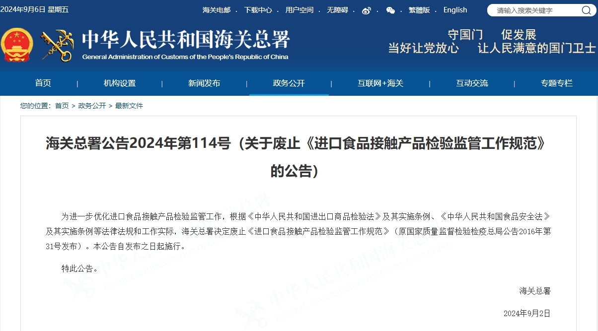 02 | 海关总署公告2024年第114号(关于废止《进口食品接触产品检验监管工作规范》的公告) |