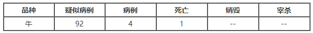 9月12日,莫桑比克通报加扎省发生1起口蹄疫疫情, 123头牛感染。