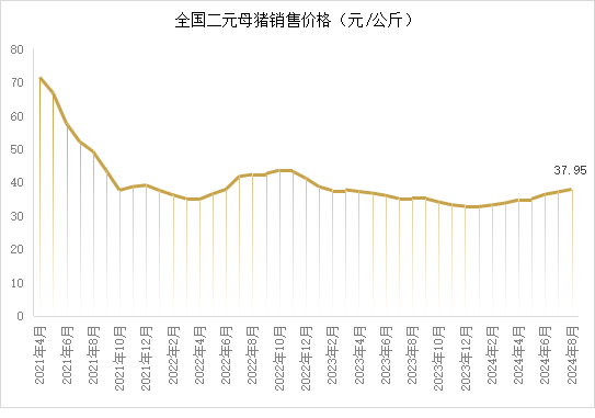 1、2024年8月份全国二元母猪销售价格37.95元/公斤,环比上涨2.2%,同比上涨 7%;