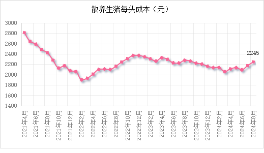 3、2024年8月份散养生猪每头成本2245元,环比增长3.3%,同比下降1.4%;