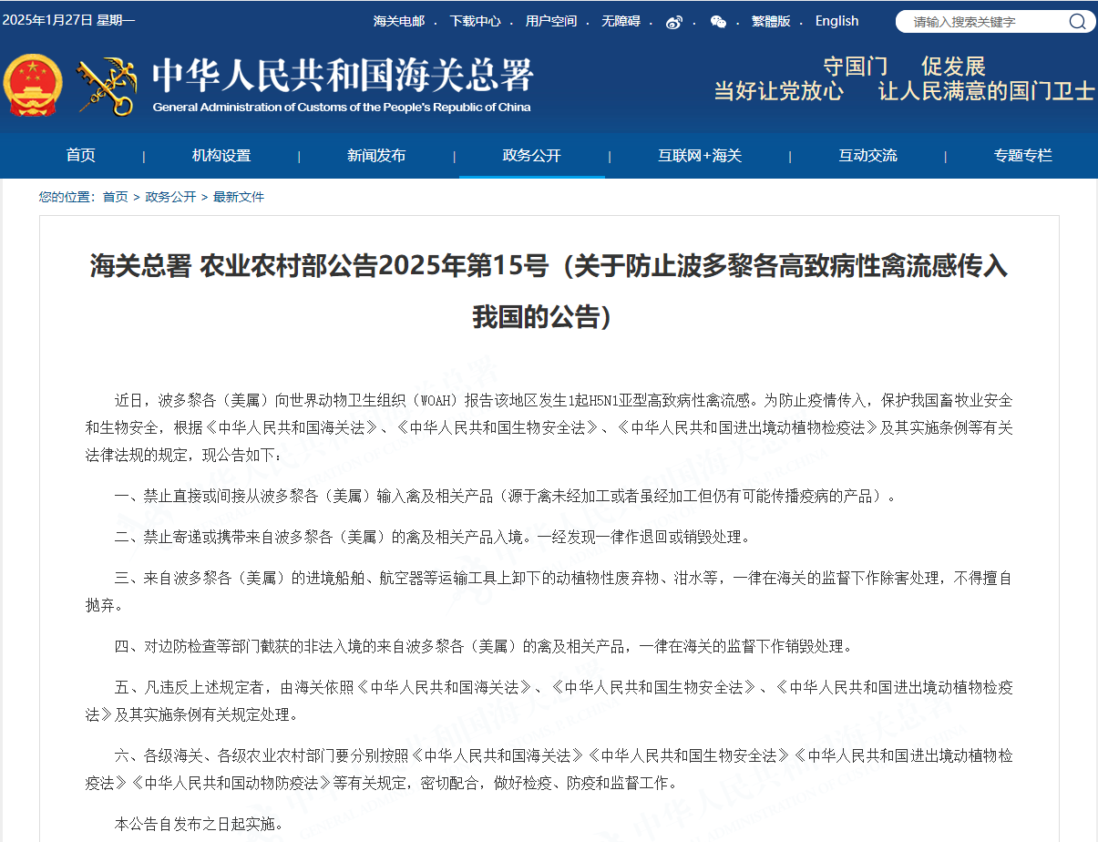 01 | 海关总署 农业农村部公告2025年第15号(关于防止波多黎各高致病性禽流感传入我国的公告) |