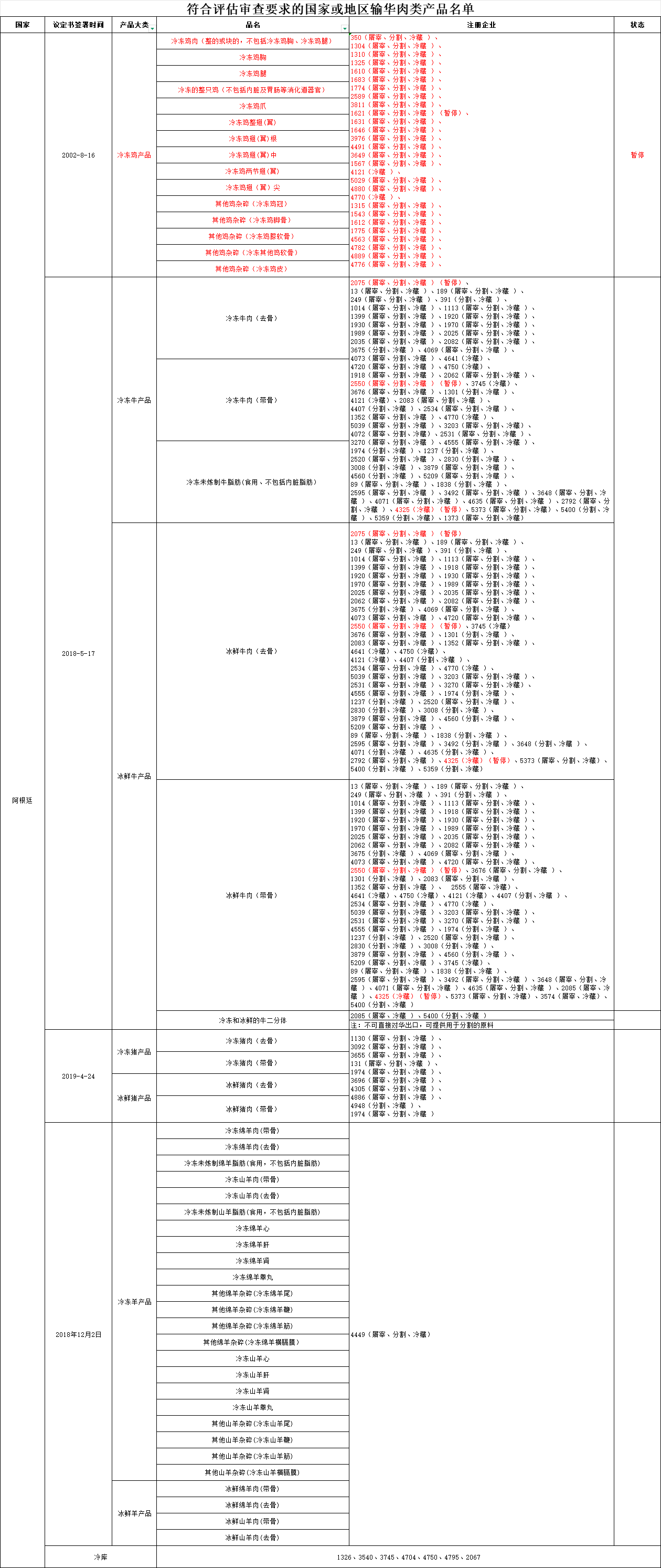 近日,海关总署更新《符合评估审查要求的国家或地区输华肉类产品名单》: