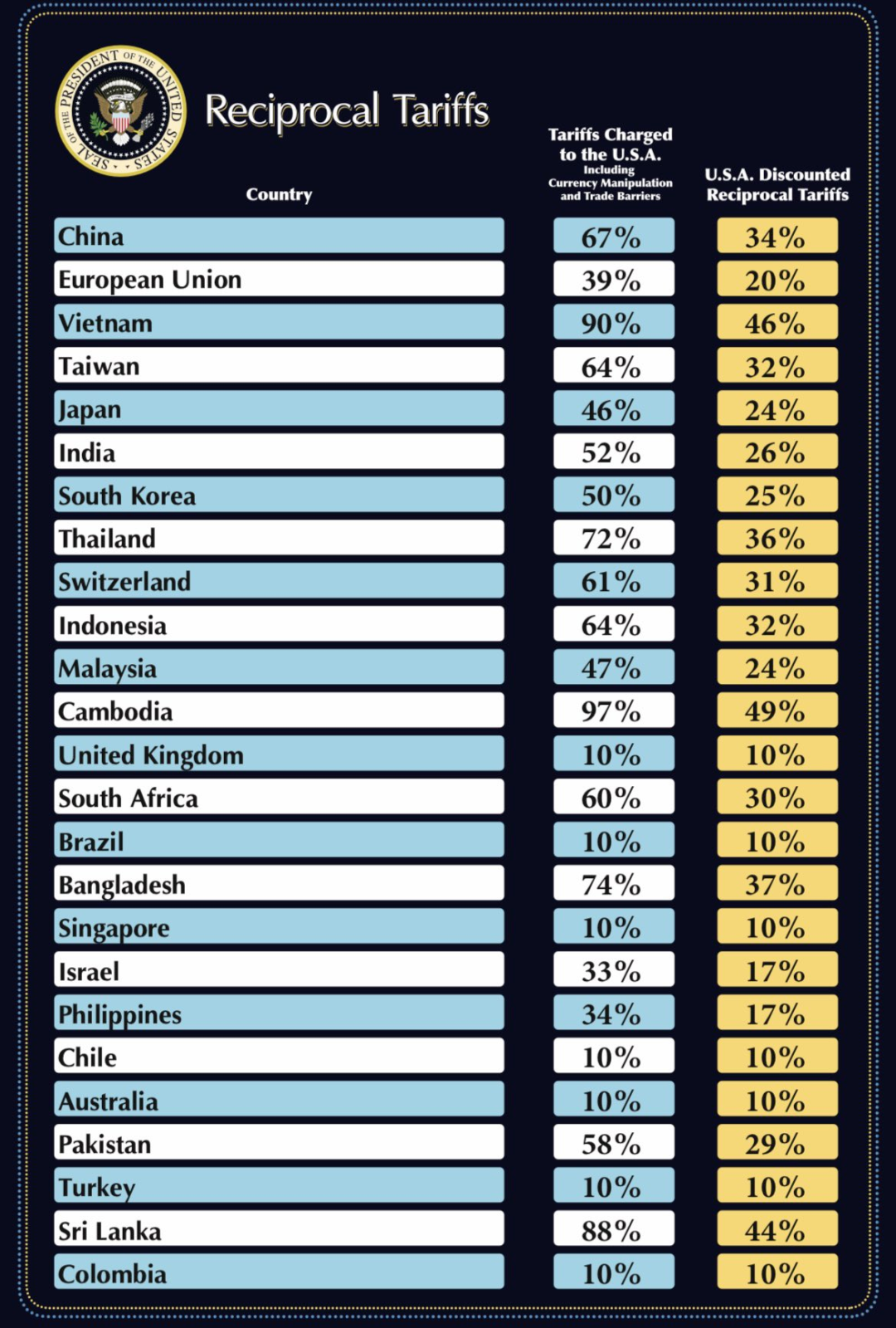 特朗普列入图表的国家征收不同税率的国家和地区达40多个,这些国家和地区之外的国家,一律征收10%的进口货品税率。