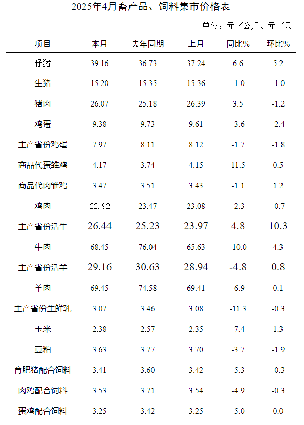 据对全国500个县集贸市场和采集点的监测,2025年4月份,仔猪、商品代雏鸡、肉牛、肉羊、玉米价格环比上涨,生猪、猪肉、鸡蛋、鸡肉、生鲜乳、豆粕、育肥猪配合饲料、肉鸡配合饲料价格环比下跌,蛋鸡配合饲料价格环比持平。按集贸市场监测口径,本月猪粮比价为6.39:1,比上月下跌0.15个点。