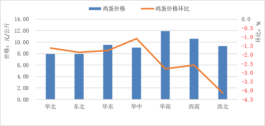 全国鸡蛋平均价格9.38元/公斤,同比跌3.6%,环比跌2.4%。河北、辽宁等10个主产省份鸡蛋平均价格7.97元/公斤,同比跌1.7%,环比跌1.8%。从涨跌情况看,辽宁、天津2个省份价格上涨,宁夏、新疆、北京、重庆、浙江等26个省份价格下跌,河北、江苏2个省份价格持平。其中,西北地区环比跌幅较大,宁夏领跌,跌幅为8.1%。从价格水平来看,华南地区鸡蛋平均价格最高,为11.91元/公斤;东北地区最低,为7.91元/公斤。
