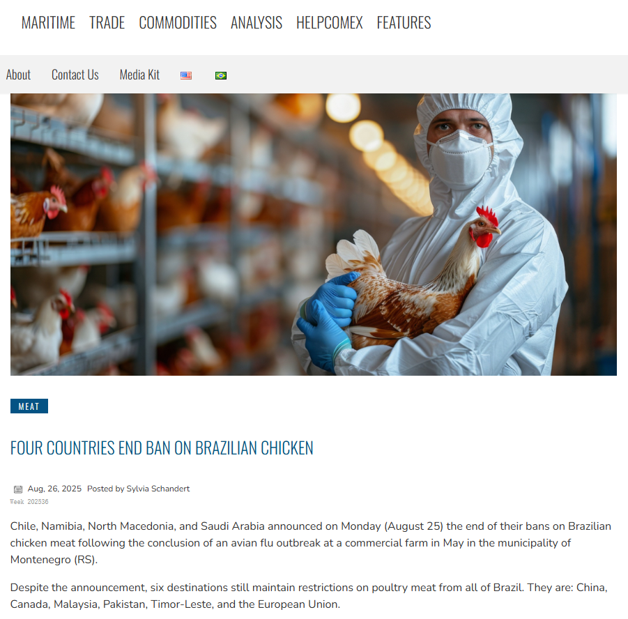 尽管宣布了这一消息,但仍有六个目的地对来自巴西全境的禽肉保持限制。它们是:中国、加拿大、马来西亚、巴基斯坦、东帝汶和欧盟。