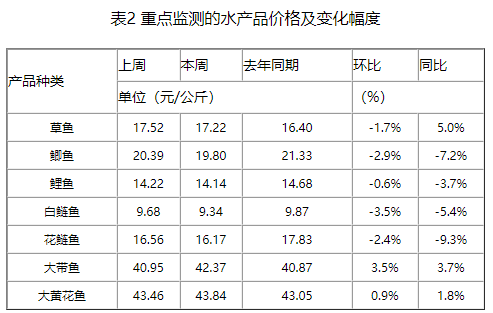 本周,重点监测的水产品草鱼、鲫鱼、鲤鱼、白鲢鱼、花鲢鱼、大带鱼和大黄花鱼与上周相比,变化幅度在-3.5~3.5%之间(如表2所示)。