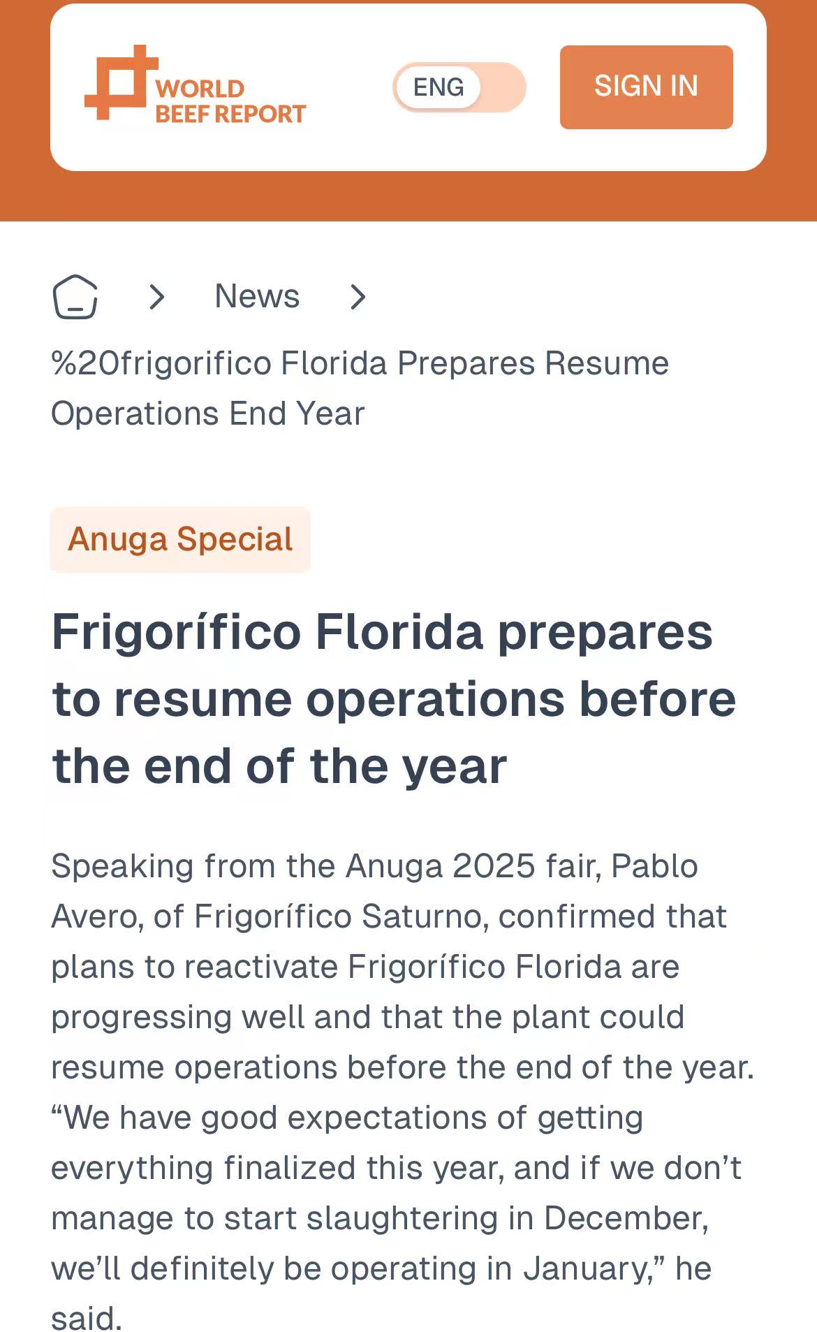 在2025年科隆国际食品博览会(Anuga 2025)上,Frigorífico Saturno公司董事长Pablo Avero确认,乌拉圭365厂(佛罗里达肉联厂)重启计划进展顺利,预计将于今年12月或明年1月恢复生产。该厂自今年5月起由Saturno公司接管运营。
