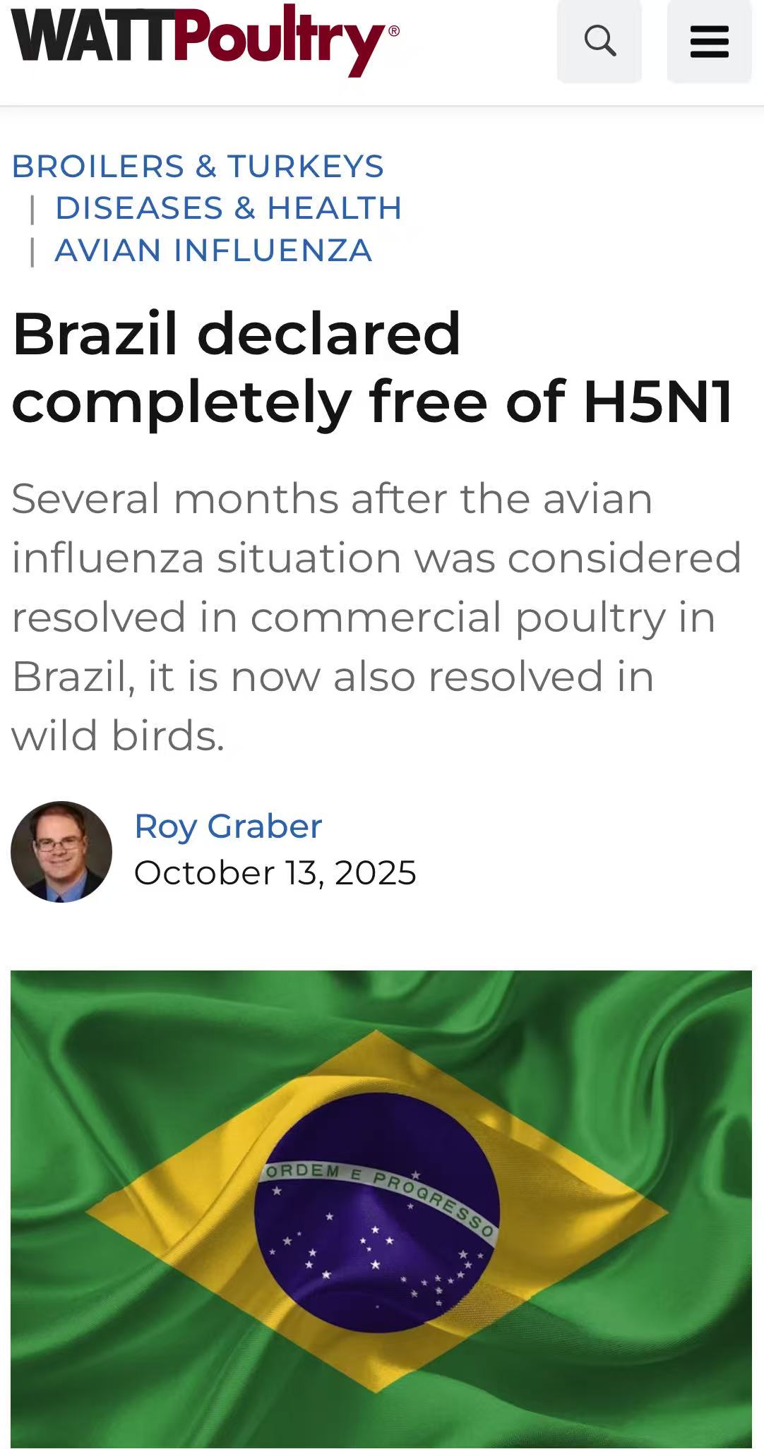 世界动物卫生组织(WOAH)于10月10日宣布,巴西高致病性禽流感(H5N1)疫情已彻底消除,涵盖家禽与野生鸟类群体,巴西正式恢复无疫国地位。