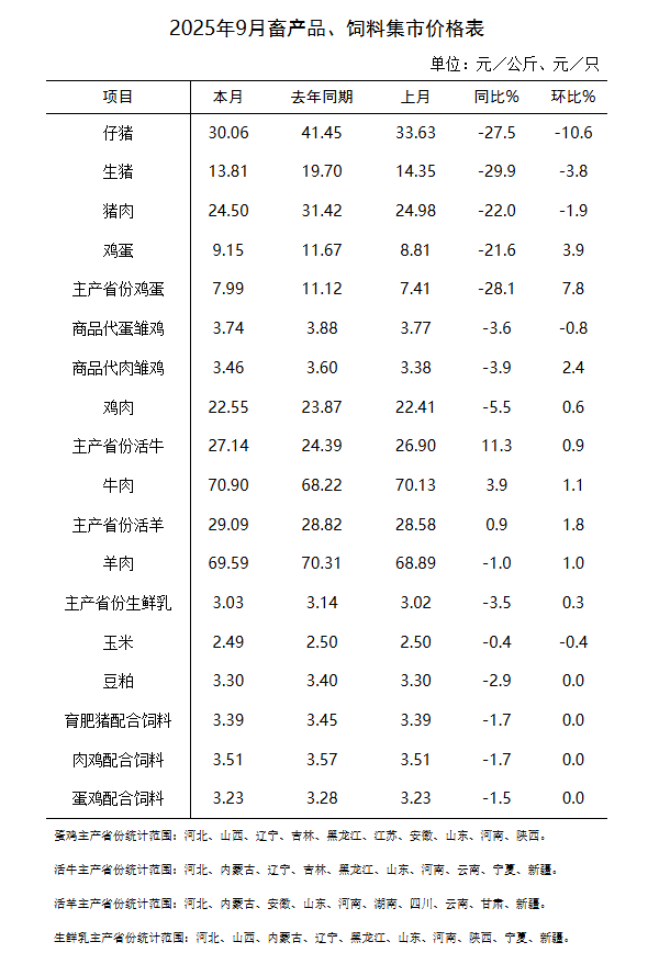 据对全国500个县集贸市场和采集点的监测,2025年9月份,鸡蛋、商品代肉雏鸡、鸡肉、肉牛、肉羊、生鲜乳价格环比上涨,生猪产品、商品代蛋雏鸡、玉米价格环比下降,豆粕、配合饲料价格环比持平。按集贸市场监测口径,本月猪粮比价为5.55:1,比上月下跌0.19个点。