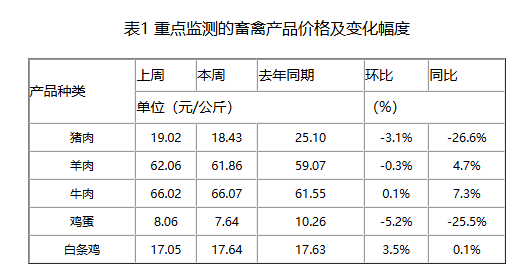 本周重点监测的畜禽产品猪肉、羊肉、牛肉、鸡蛋和白条鸡与上周相比,变化幅度在-5.2~3.5%之间(如表1所示)。