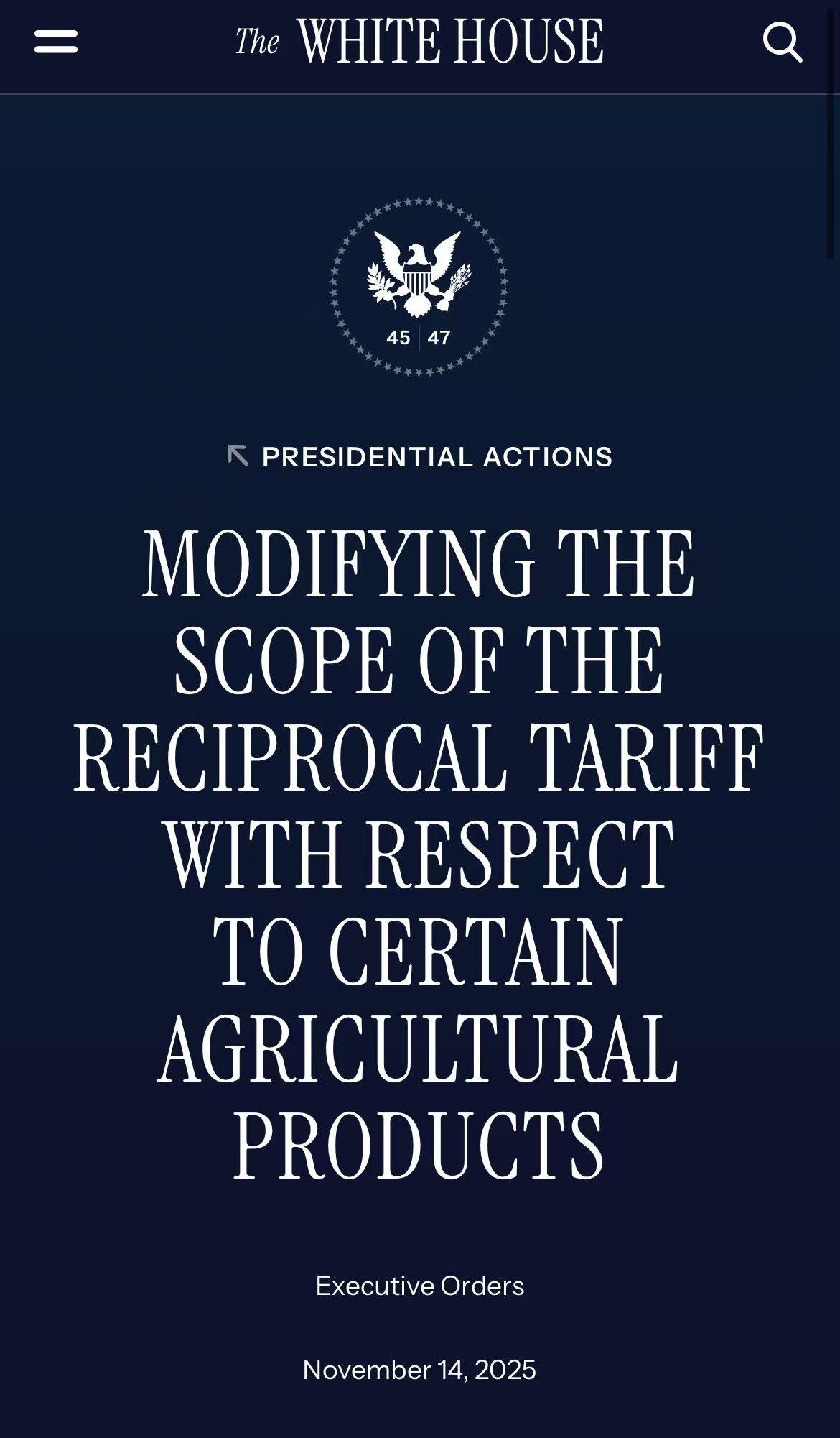 特朗普在文件中指出,此举是基于与贸易伙伴的谈判进展、美国国内市场需求及产能评估后作出的决定。更新后的税率适用范围将于2025年11月13日凌晨12点01分(东部标准时间)正式生效,适用于所有报关进口或从仓库提取消费的货物。