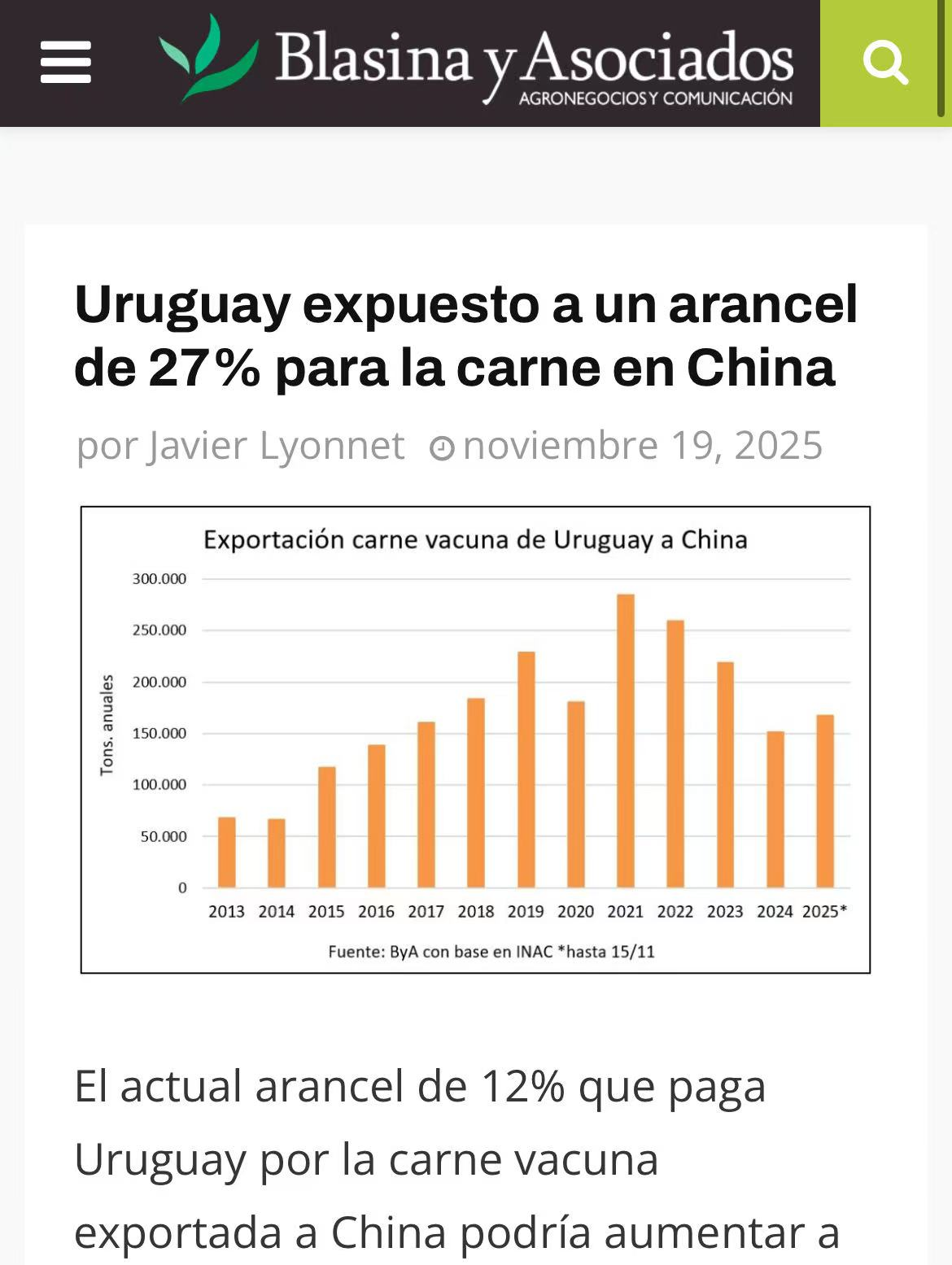 外媒消息,据乌拉圭行业代表透露,目前乌拉圭对华牛肉出口享受12%的关税待遇,但这一税率可能于11月26日后出现显著上升。根据中国即将公布的保障措施调查决议,可能额外加征15%的税率,使总关税水平达到27%。