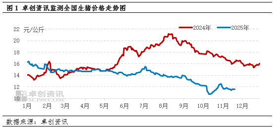 进入11月,生猪价格短暂企稳后再度显露出疲态。截至11月24日,全国外三元生猪均价已跌至11.52元/公斤,较月初下跌4.71%。随着12月传统消费旺季临近,市场本应迎来价格提振窗口,但供应端压力持续加码与需求端支撑不足的矛盾或有突出表现,2025年12月猪价不仅缺乏上涨动力,反而存在下跌风险。