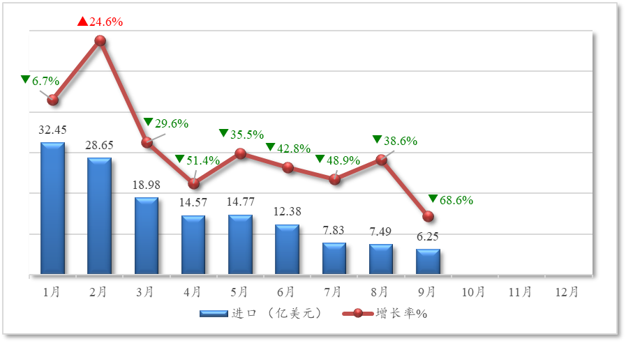 从月度走势看,出口在5月触底后呈现逐月回升态势,至9月当月出口额9亿美元,同比下降8.6%,降幅较前期明显收窄。进口方面,除2月实现24.6%的同比正增长外,其余月份均为负增长,4月、7月及9月降幅均超过48%,9月当月降幅进一步扩大至68.6%,进口持续深度低迷,未见好转迹象。