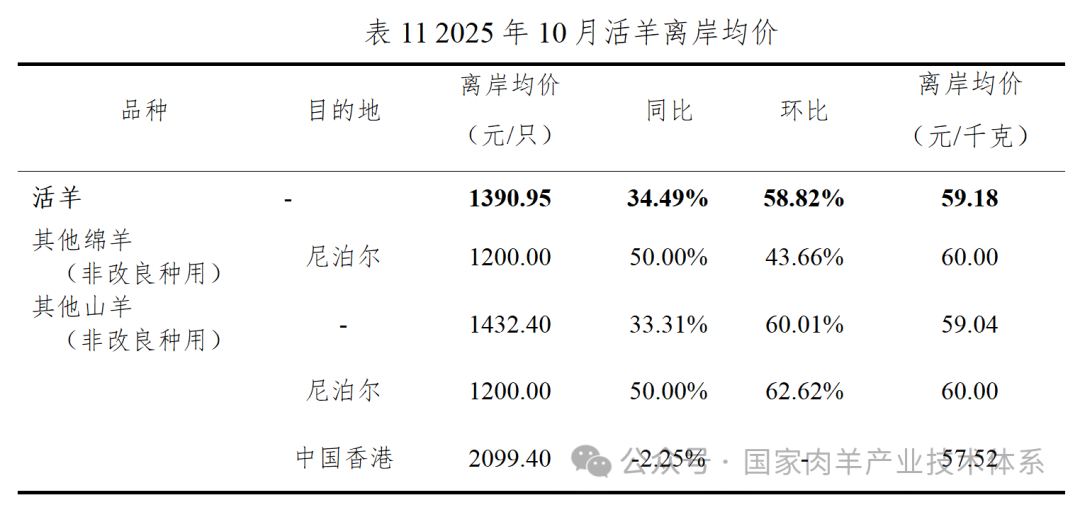 中国活羊离岸均价为1390.95元/只(59.18元/千克),本月出口至尼泊尔的活羊价格显著增长,绵羊的价格与去年同期相比增长50.00%,出口至尼泊尔的其他山羊价格涨幅与绵羊相同(如表11所示)。