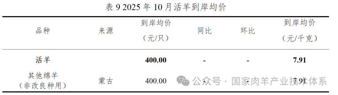 活羊到岸均价为400.00元/只(7.91元/千克),由于仅从蒙古国进口活羊,,且与今年1月份向蒙古国进口活羊的到岸均价相同,进口均价稳定(如表9示)。
