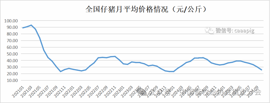 2、2025年10月份全国仔猪价格25.80 元/公斤,环比下跌14.2%,同比下跌29.1%。