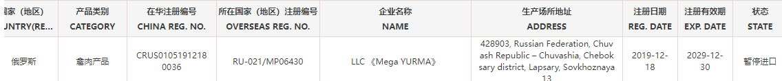 暂停受理俄罗斯2家禽肉产品(注册编码为:RU-032/DL03369、RU-021/MP06430)自2025年11月27日(含)起启运的输华产品进口申报。