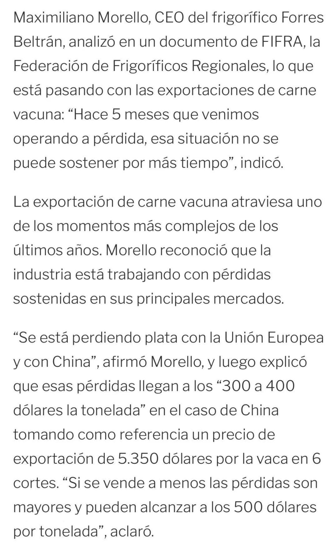 区域肉类加工商联合会(FIFRA)的报告揭示了当前严峻形势。阿根廷重要出口企业Forres Beltrán(即4720厂)的首席执行官马克西米利亚诺·莫雷洛指出,行业已连续五个月在亏损中运营,局面“危急且仍在恶化”。