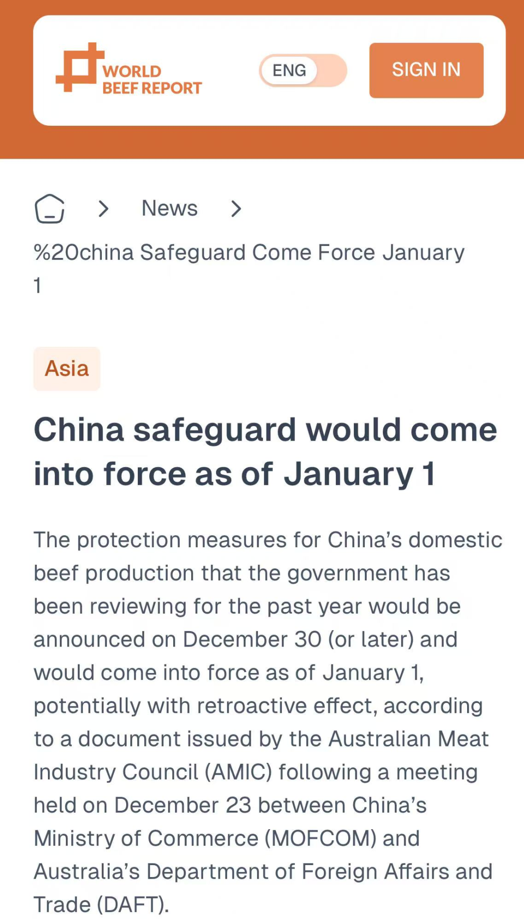 根据澳大利亚肉类行业委员会(AMIC)发布的最新消息,称中国将于1月1日起对进口牛肉实施保障措施。该措施预计在12月30日或之后正式公布,并可能追溯至1月1日生效。