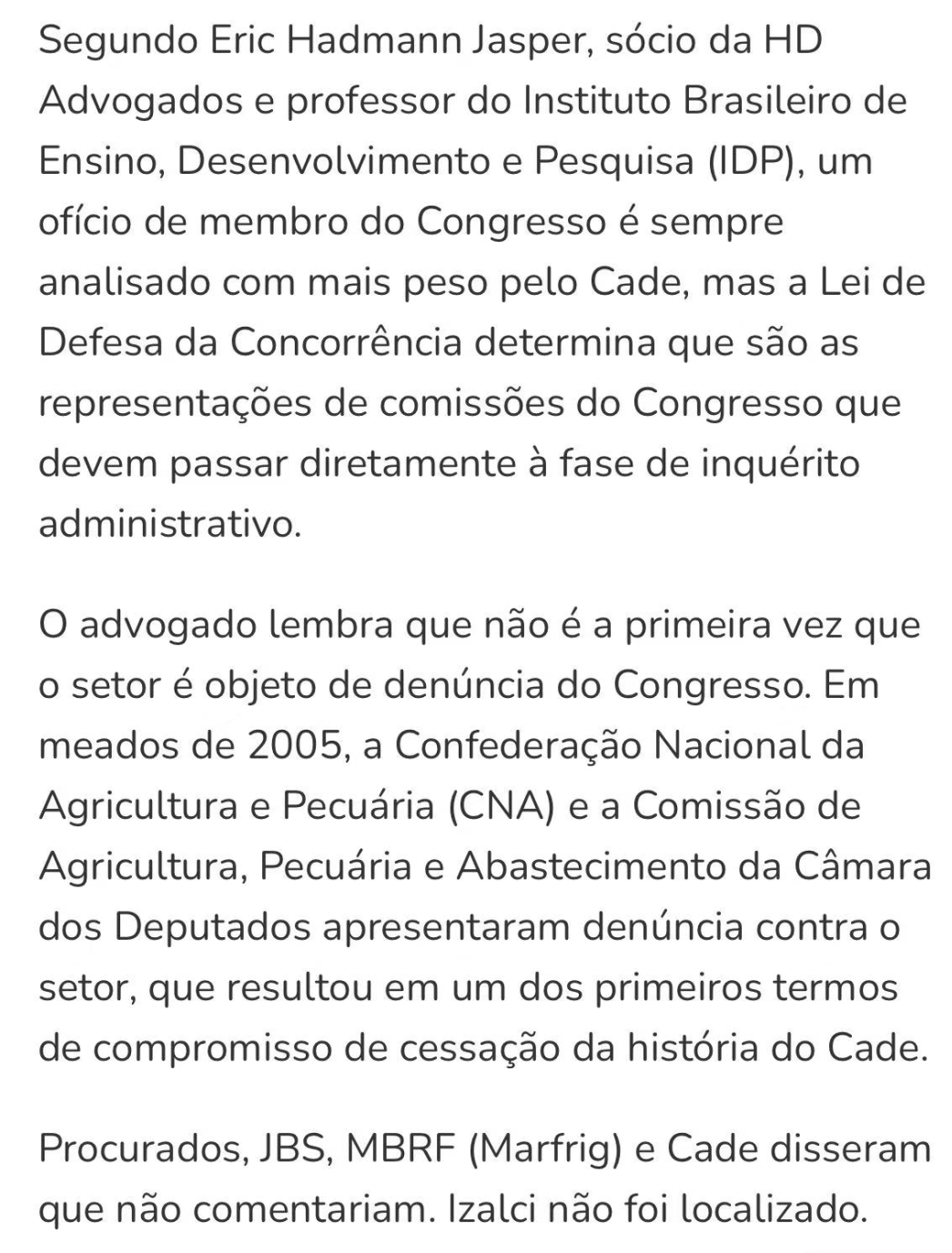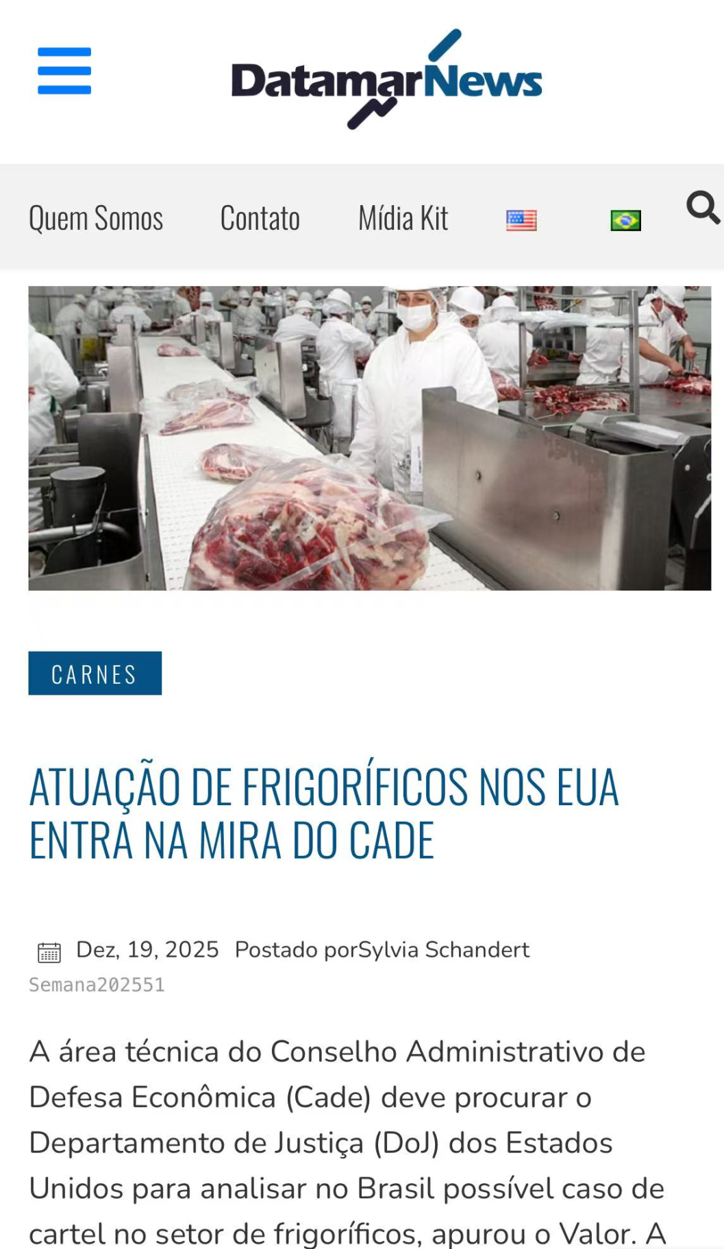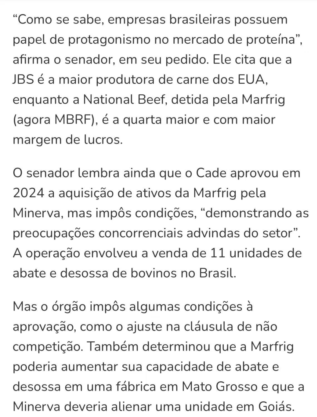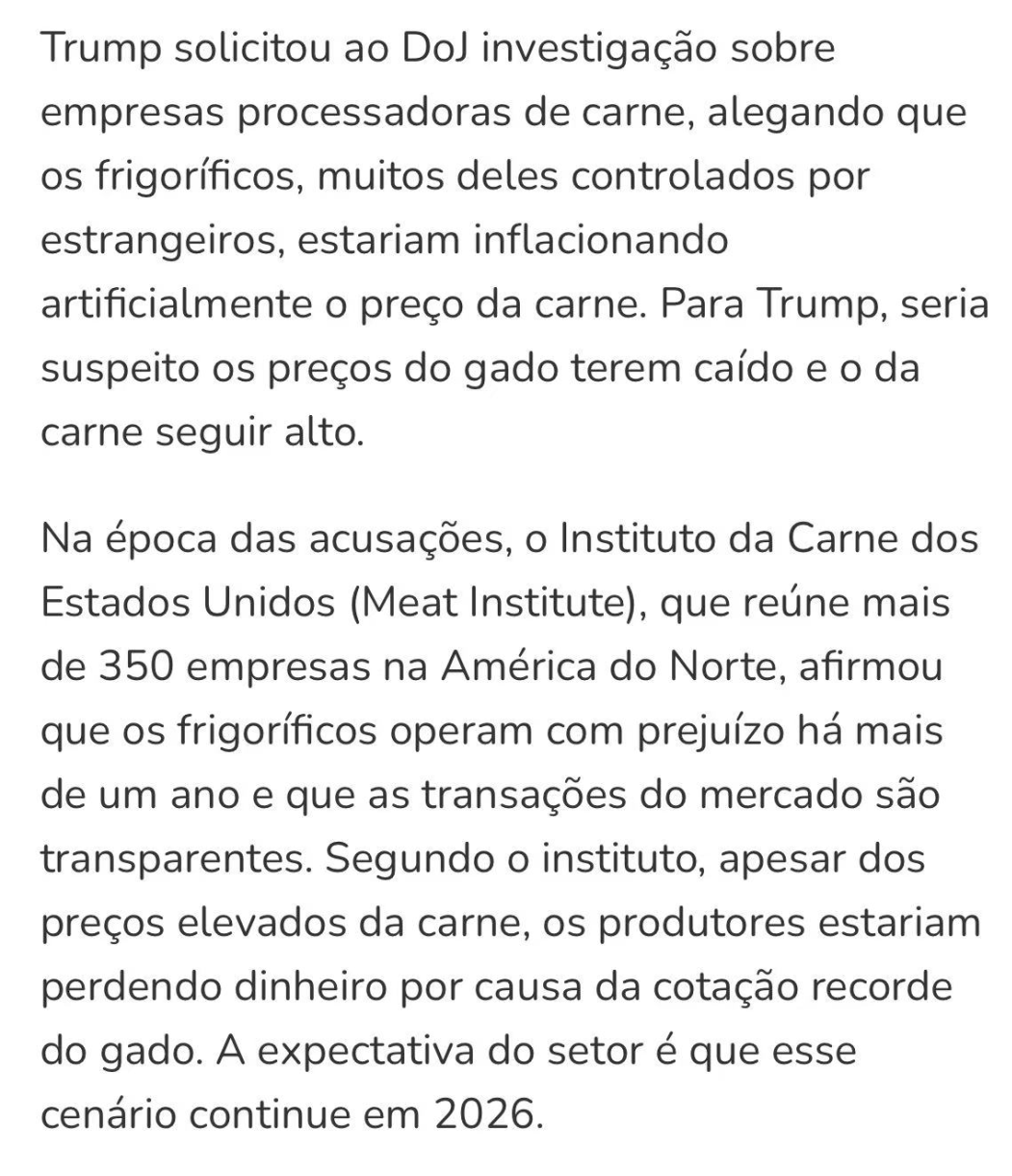巴西反垄断机构CADE正考虑介入美国对肉类加工行业涉嫌垄断行为的调查。此前,巴西参议员致函CADE,指出美国总统特朗普已要求美国司法部调查外资控股企业可能存在的串谋定价行为,并特别提到巴西企业JBS与美国第四大肉类企业National Beef(由巴西Marfrig控股)在市场中的主导地位。