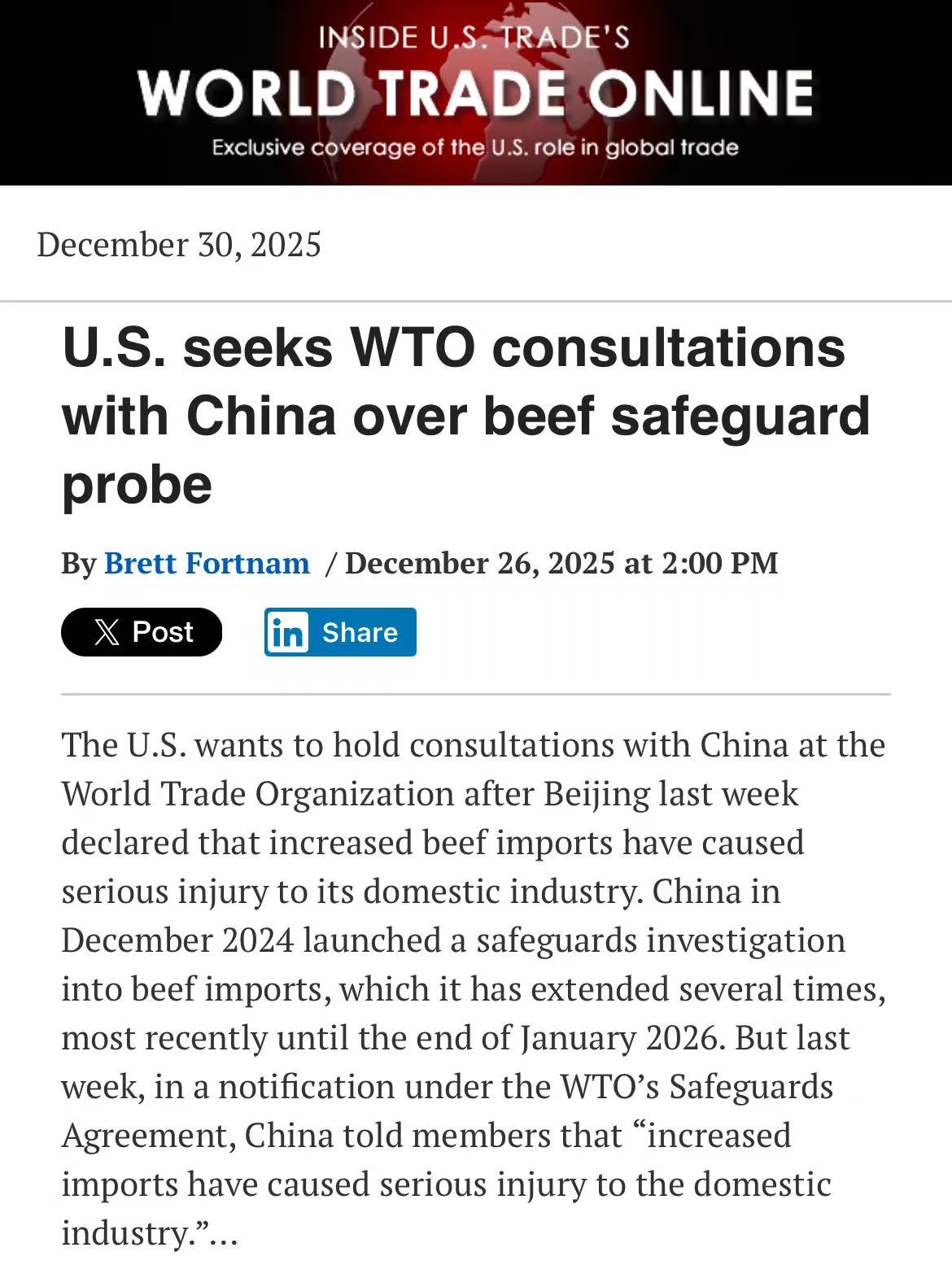 美国就中国牛肉进口保障措施向WTO提出磋商请求。中国于2024年12月启动相关调查,并于近日向世贸组织通报,认定牛肉进口激增已对国内产业造成“严重损害”。该调查已多次延期,目前截止期延至2026年1月。