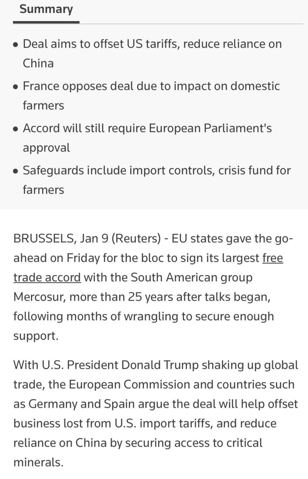 在历经四分之一世纪的艰难谈判后,欧盟与南美南方共同市场(Mercosur)的自由贸易协定终于冲破最后一道内部障碍。尽管法国等国因担心冲击本土农业而激烈反对,欧盟多数成员国仍在1月9日投票支持,为这项划时代协议的签署扫清道路。