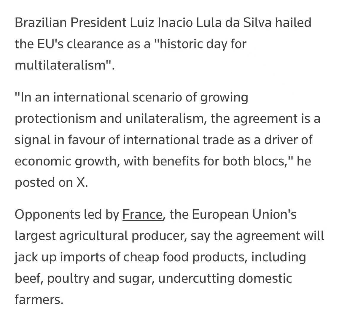 该协定不仅是欧盟史上最大的贸易协议,更被视为其重塑全球供应链、减少对中美依赖的战略之举。而对资源丰富的南共市国家,尤其是农业巨头巴西而言,这意味着打开了利润丰厚的欧洲市场大门。