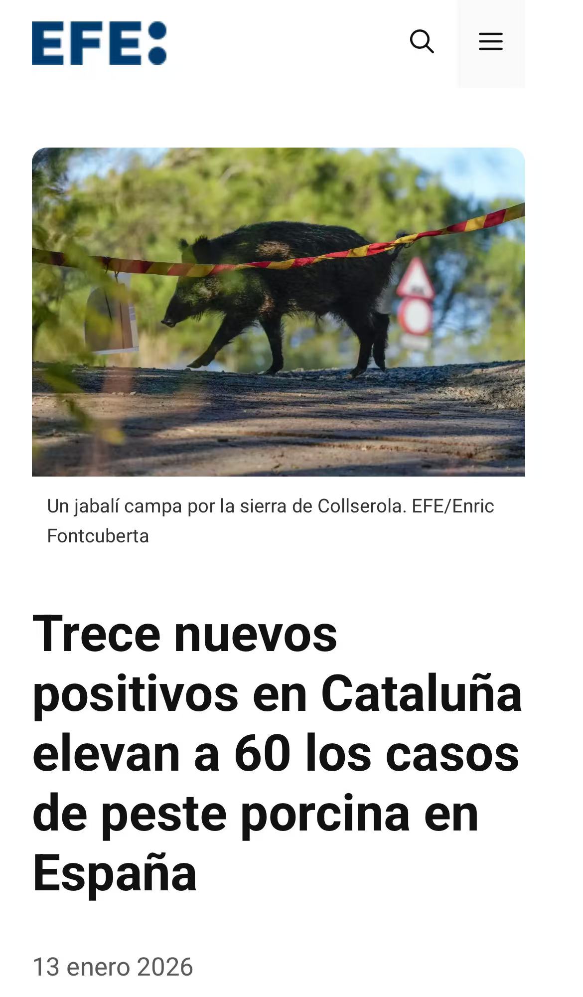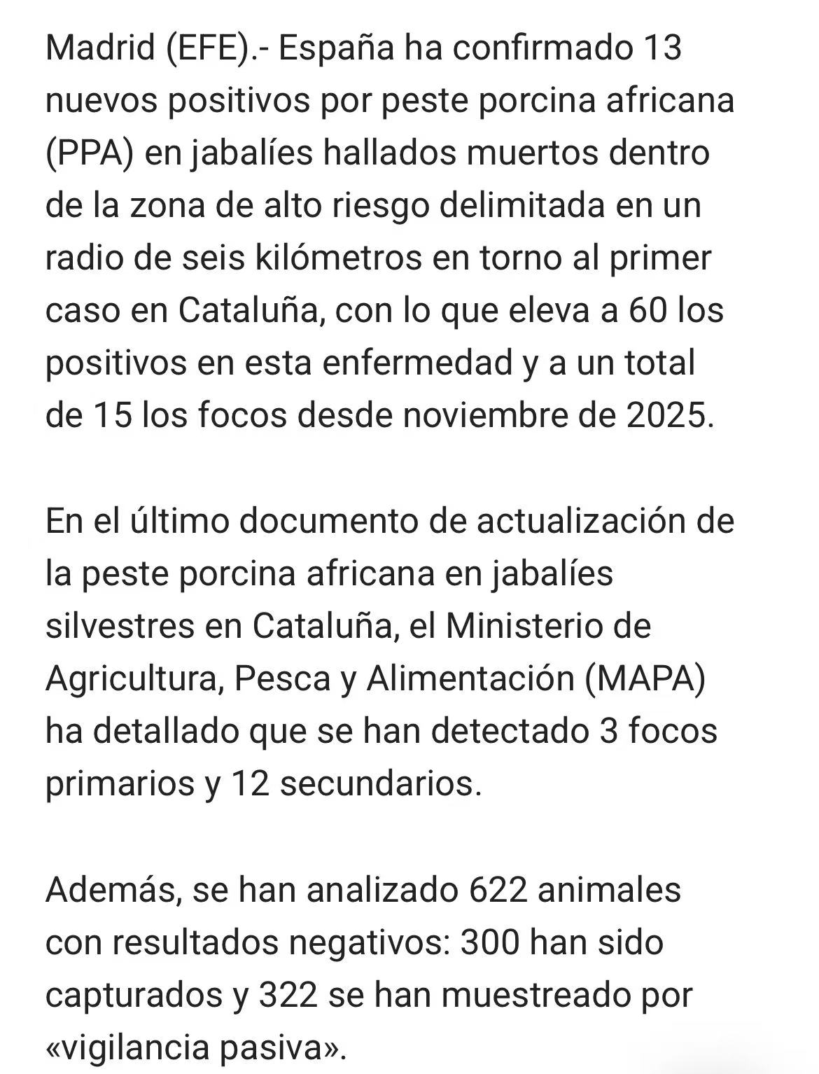 西班牙加泰罗尼亚地区新增13例非洲猪瘟野猪病例,全国累计确诊数升至60例。所有新病例均出现在最早疫点周边6公里内的高风险区,疫情目前未扩散至养殖场。