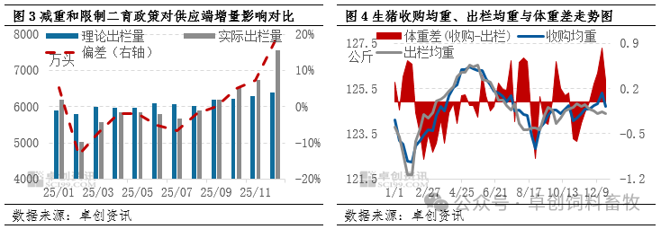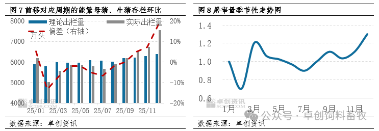 出栏量:从理论出栏的角度看,2025年1-12月生猪出栏量对应2024年3月-2025年2月的能繁母猪,期间农业农村部数据及卓创资讯监测规模场数据均以连续增加走势为主。而以新生仔猪作为中间环节验证数据,1-12月生猪出栏量对应2024年7月-2025年6月的新生仔猪,期间新生仔猪环比呈增加走势,6-7月、10月和12月涨幅较大,其中6-7月及10月出栏超预期增加,导致供应过剩,猪价先后出现跌幅扩大和跌至最低点现象,12月因消费端超预期增量,供应对猪价利空效果被缓冲。