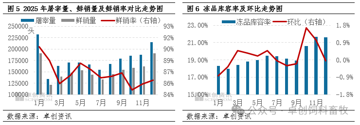 屠宰量呈季节性的先减后增再减再震荡增加的走势,卓创资讯监测样本2025年日均屠宰量为177111.90头,同比上升10.12%,也是近五年的最高水平,对猪价有一定支撑。鲜销量与屠宰量走势基本一致,鲜销率呈季节性先降后涨再降的走势,但四季度有明显下滑。