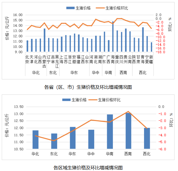 全国生猪平均价格12.17元/公斤,同比跌26.9%,环比跌3.0%。从涨跌情况看,四川价格上涨,北京、辽宁、新疆、福建、黑龙江等28个省份价格下跌,重庆价格持平。其中,东北地区环比跌幅较大,辽宁领跌,跌幅为5.8%。从价格水平来看,西南地区生猪平均价格最高,为13.06元/公斤;东北地区最低,为11.61元/公斤。