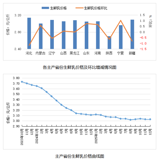 内蒙古、黑龙江等10个主产省份生鲜乳平均价格3.03元/公斤,同比跌2.6%,环比持平。
