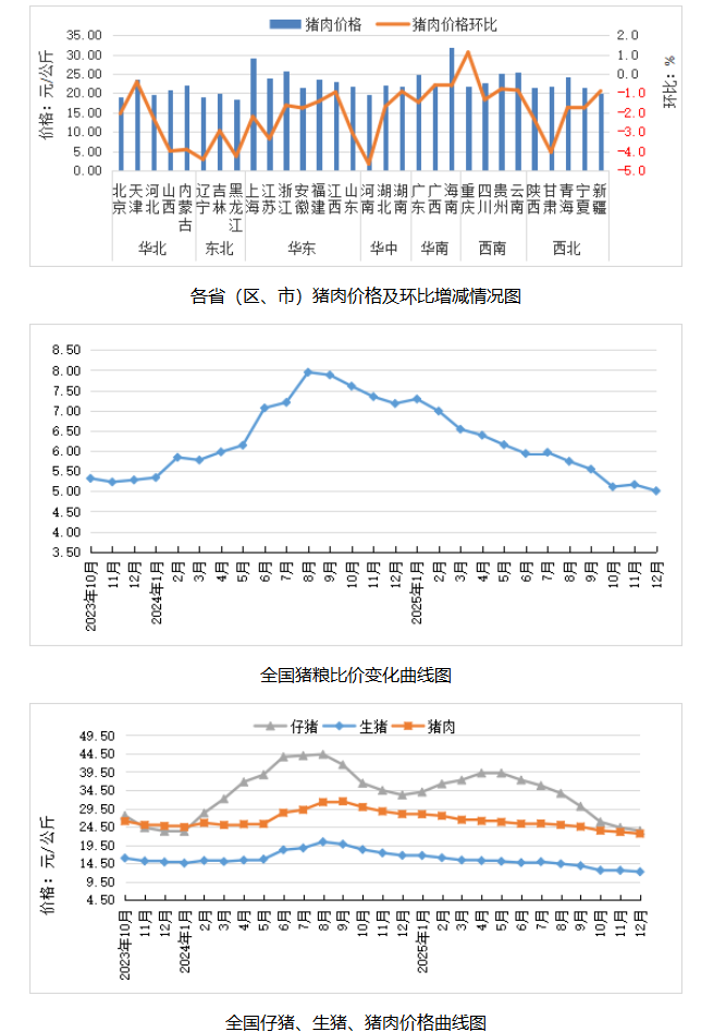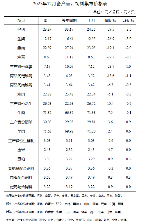 据对全国500个县集贸市场和采集点的监测,2025年12月份,鸡蛋、肉羊、豆粕、肉鸡配合饲料价格环比上涨,生猪产品、商品代雏鸡、鸡肉、肉牛价格环比下降,生鲜乳、玉米、育肥猪配合饲料、蛋鸡配合饲料价格环比持平。按集贸市场监测口径,本月猪粮比价为5.01:1,比上月下跌0.15个点。