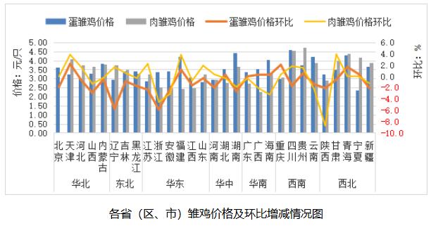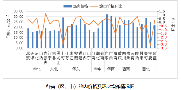 全国鸡肉平均价格22.28元/公斤,同比跌5.1%,环比跌0.3%。从涨跌情况看,内蒙古、福建、陕西、重庆、安徽等15个省份价格上涨,宁夏、上海、山西、海南、甘肃等14个省份价格下跌,江西价格持平。其中,东北地区环比涨幅较大,吉林领涨,涨幅为0.3%;西北地区环比跌幅较大,宁夏领跌,跌幅为3.1%。