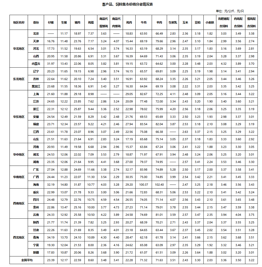 全国仔猪平均价格23.39元/公斤,同比跌29.5%,环比跌3.5%。从涨跌情况看,全国29个监测省份价格均下跌。其中,东北地区环比跌幅较大,辽宁领跌,跌幅为11.3%。从价格水平来看,华南地区仔猪平均价格最高,为27.89元/公斤;华北地区最低,为21.85元/公斤。
