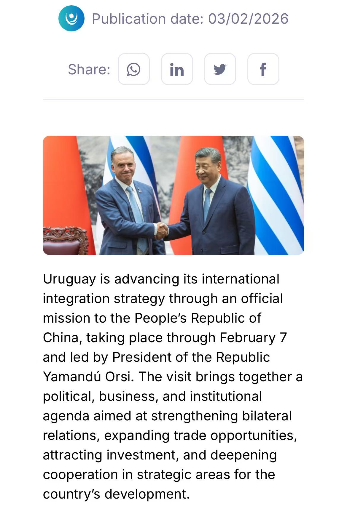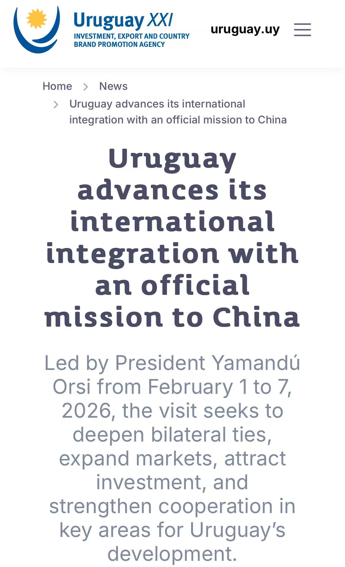 2026年2月1日至7日,乌拉圭总统亚曼杜·奥尔西率团对中国进行正式访问,旨在推动两国关系迈向新高度。此次访问的核心成果体现在2月3日与中国国家主席习近平的高层会晤中,双方签署了一系列涵盖广泛领域的合作协议,其中农牧渔业成为深化务实合作的重点。