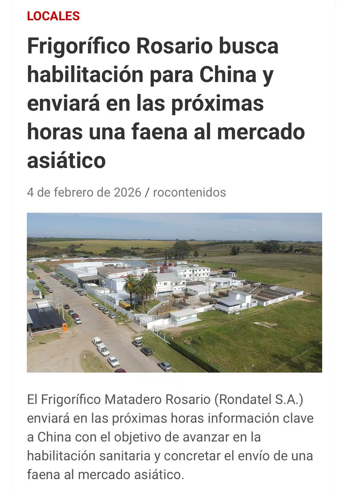 乌拉圭肉类加工企业Frigorífico Rosario(Rondatel S.A.)——22厂,正加紧推进对华出口准入程序,已按中方要求补充提交相关文件及生产样品,以期在农历新年前获准向中国出口牛肉。