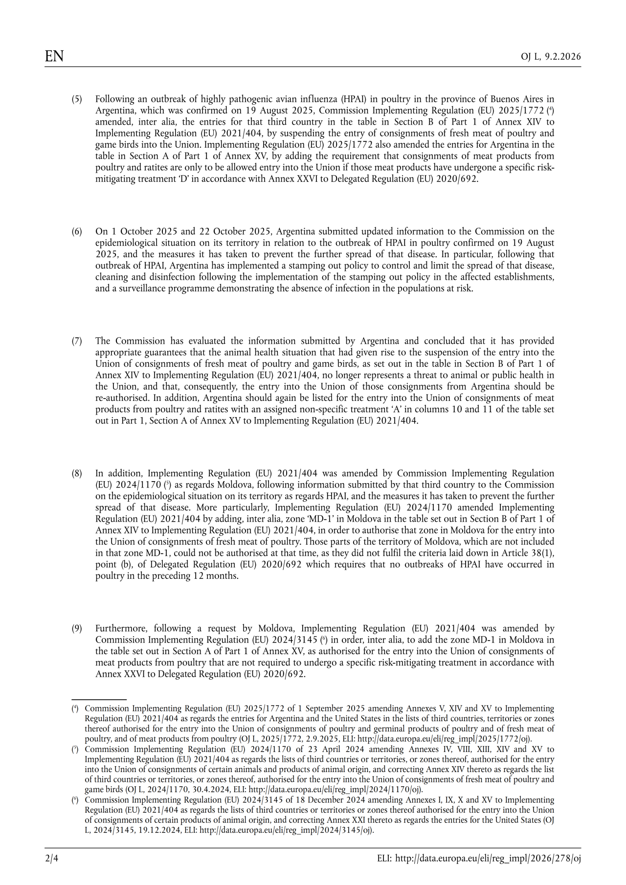 根据欧盟官方2月9日公布的法规(EU) 2026/278,欧盟已正式恢复阿根廷禽肉及其制品的进口资格。新规将于3月1日起生效。