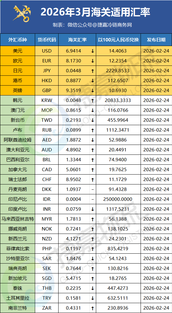 根据《中华人民共和国海关进出口货物征税管理办法》(海关总署令2005年第124号)第十六条的规定,海关每月使用的计征汇率为上一个月第三个星期三(第三个星期三为法定节假日的,顺延采用第四个星期三)中国人民银行公布的外币对人民币的基准汇率;